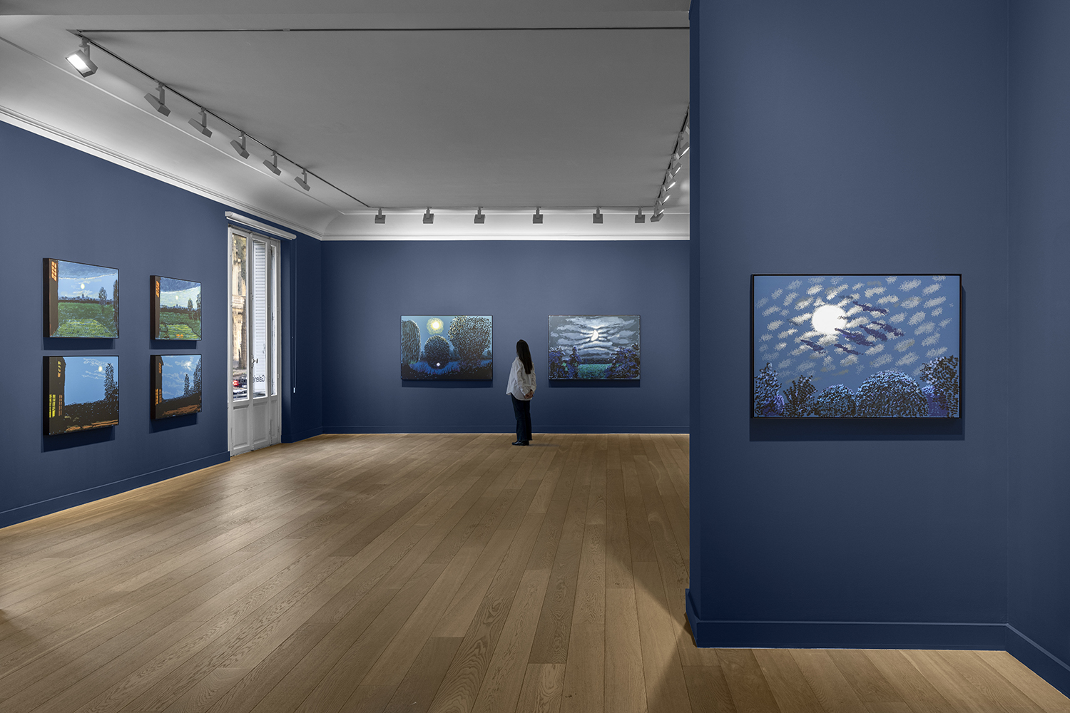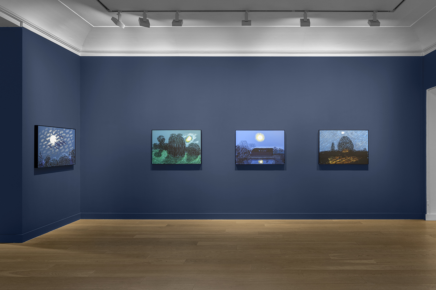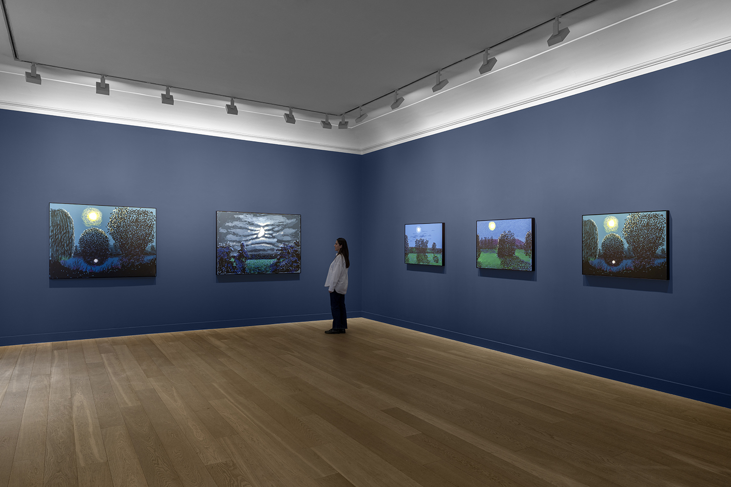 It just so happened that the artist had just read Maupassant’s wonderful short story, "Clair de lune", which is set in the same landscape. That was all it took for Hockney to decide to begin a series of works: painting every full moon throughout the year. The result is 15 night-time landscapes spanning from April 8th to December 5th, 2020. On the night of October 31st, Hockney produced five drawings, this time changing his viewpoint: he left his window and went out into the garden. We can see the façade of the house with its lit up windows and the moon moving across the sky, from evening to morning. The last work in this series features Christmas decorations and an illuminated tree.