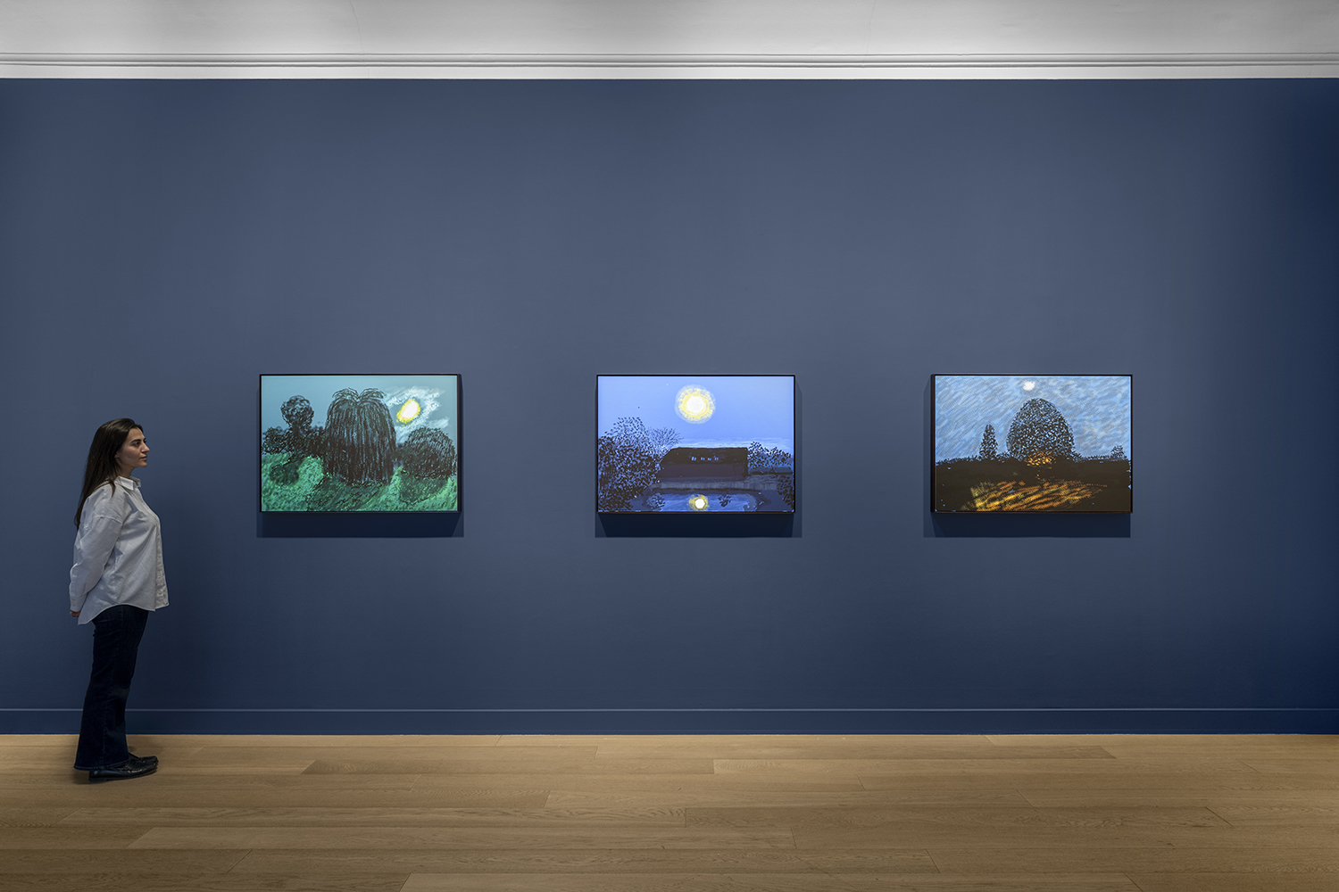 April 2020. David Hockney was spending lockdown at his home in Normandy, in the Pays d’Auge region. In the middle of the night, he was awakened by an unusual light: through his window, he saw a magnificent full moon, larger and closer than usual. Without hesitation, he grabbed his iPad and sketched what he saw from his window.
