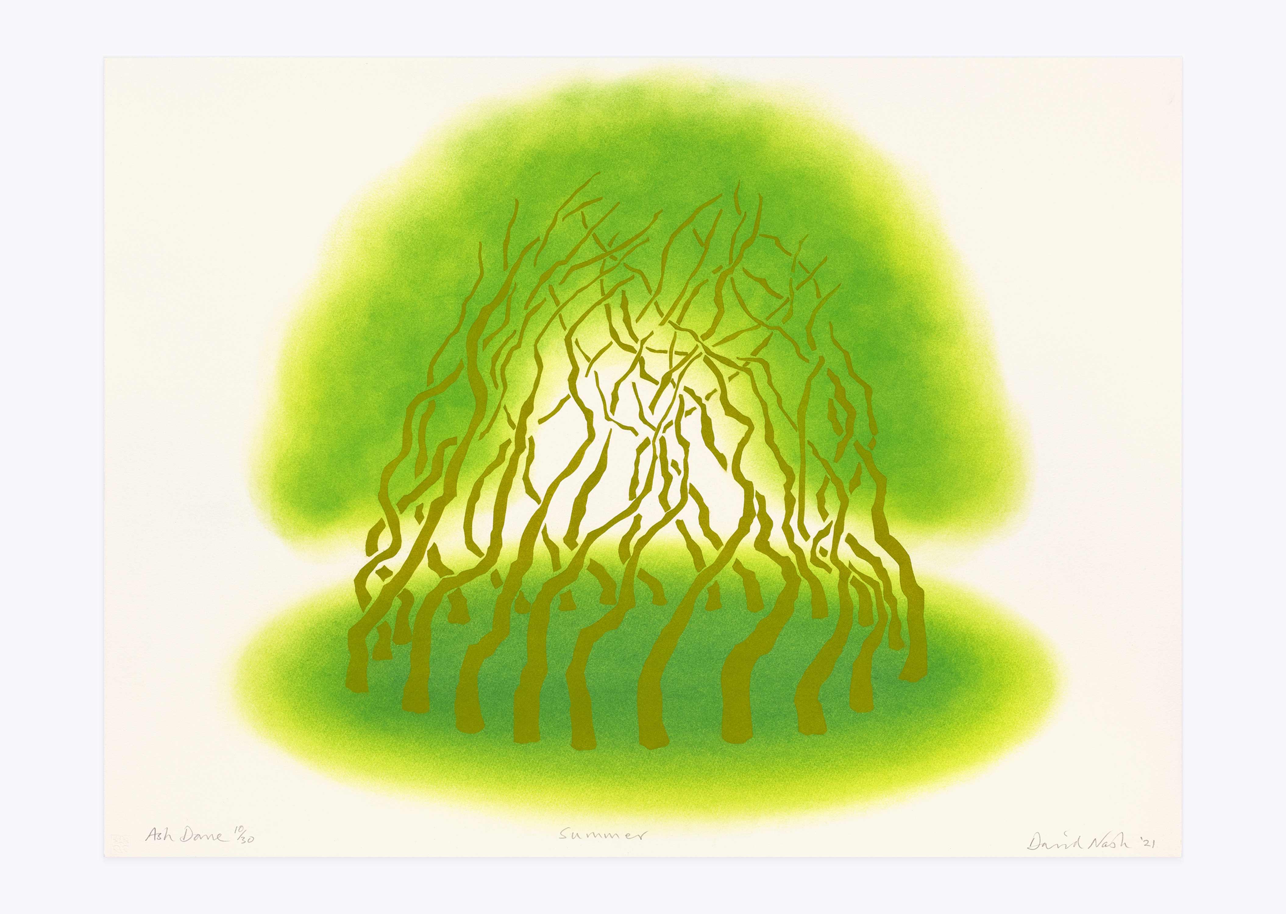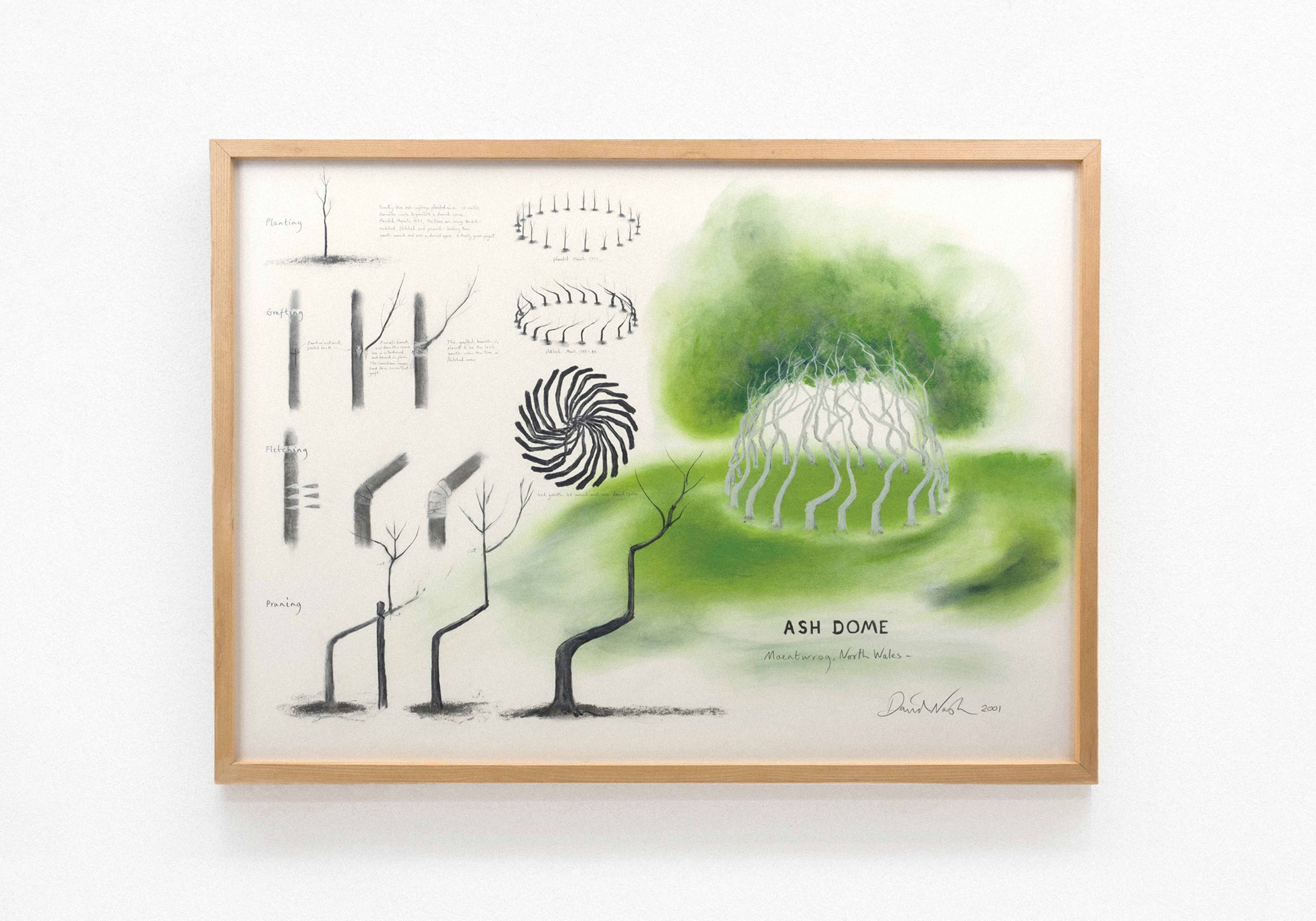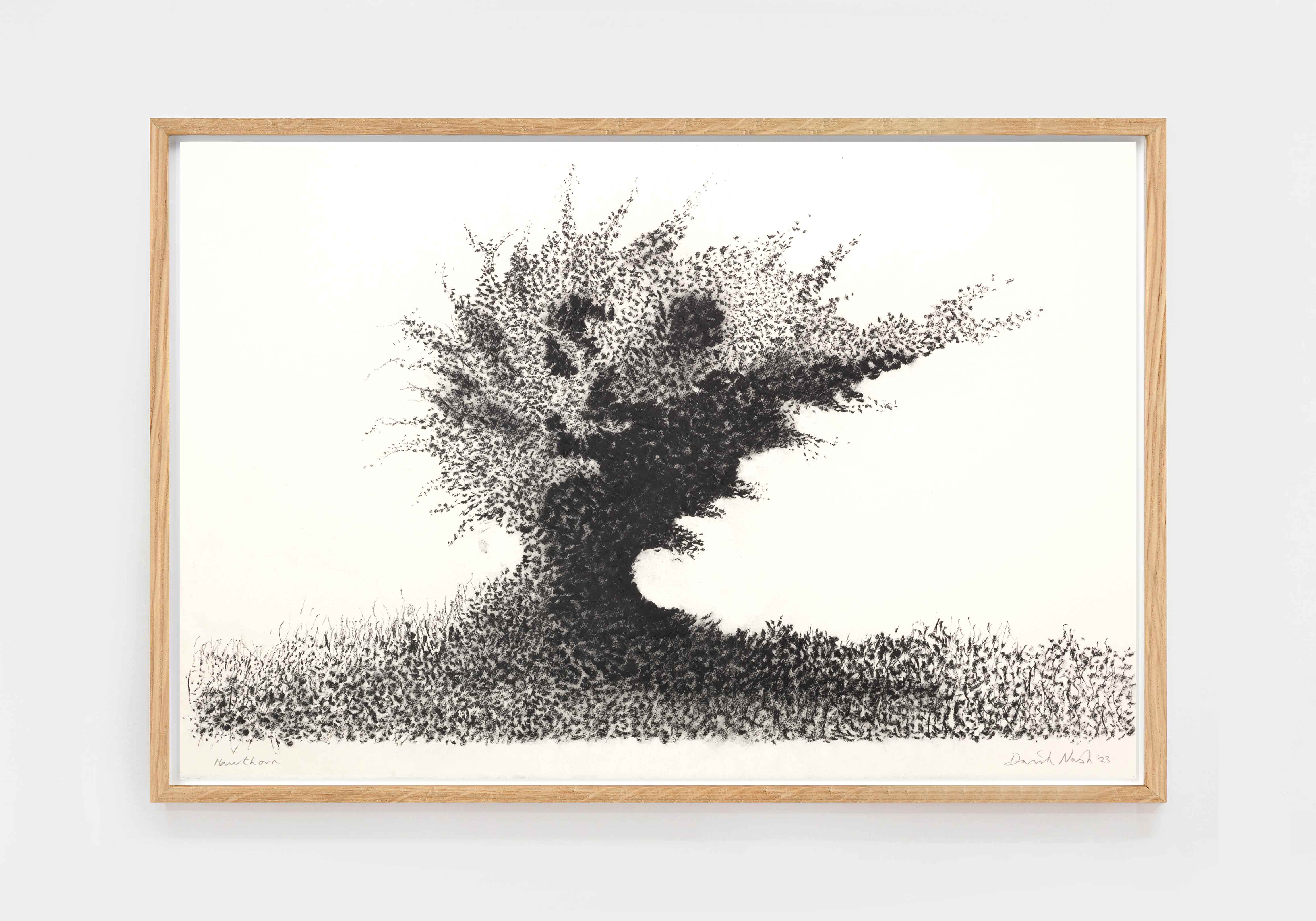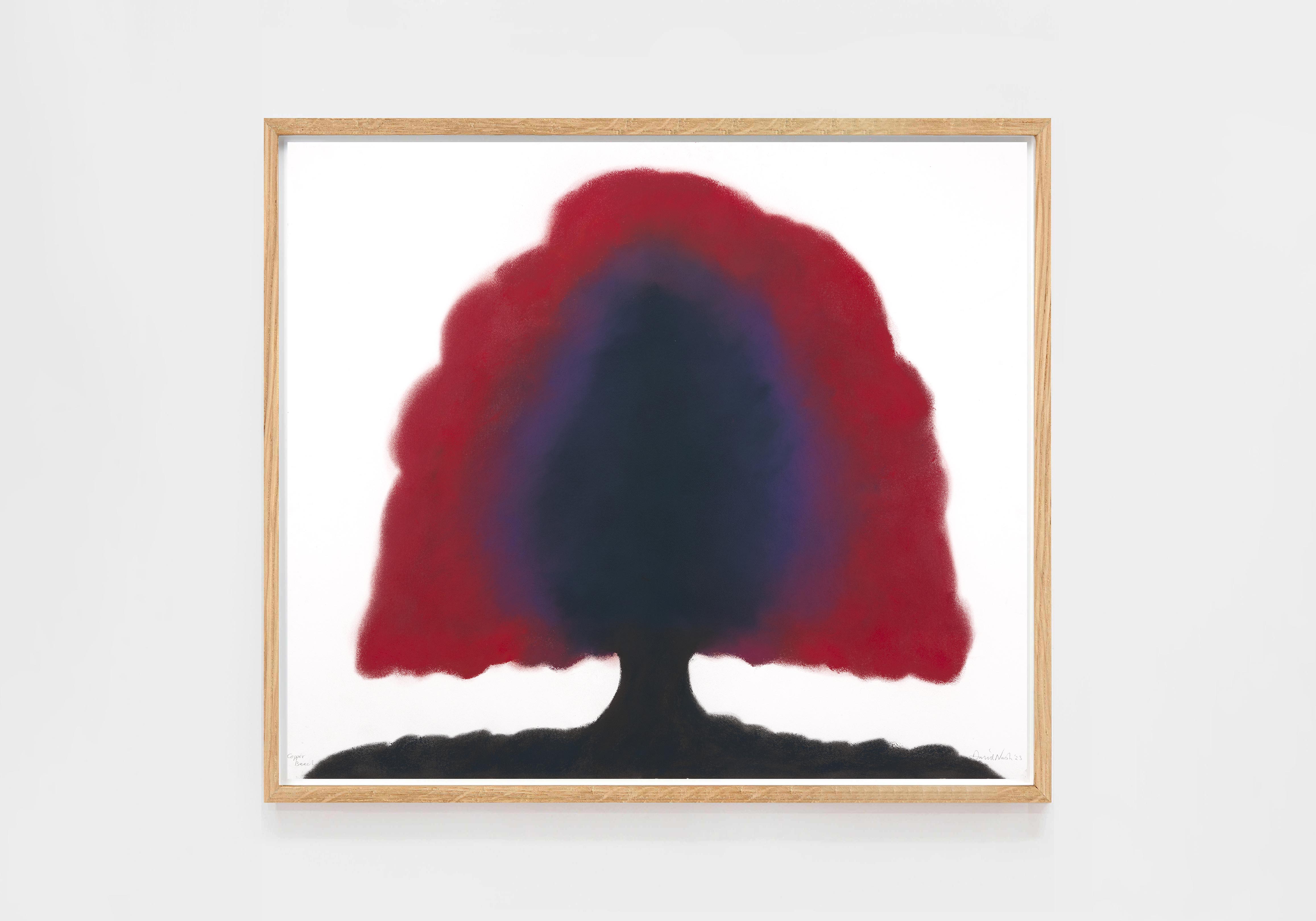 L’exposition englobe cinq décennies d’œuvres sur papier, présentant les sujets qui ont captivé l’artiste. Voisinent des œuvres au pastel, au fusain ou à l’aquarelle, ainsi que d’autres où David Nash applique des pigments bruts directement sur le papier, dans un processus énergique typique du geste d’un sculpteur. Cette pratique est née de la réalisation d’estampes au pochoir exécutées pour Lelong Éditions. Il laisse alors des halos de couleur autour de formes délimitées, mais aussi de la poussière, des taches et parfois des empreintes de doigts qui témoignent du processus de son travail ; tout ce qui, selon lui, nuit au sens du « moment juste », est réduit ou éliminé. De ce fait, une tension dynamique du geste et de la précision caractérise les dessins de Nash, reflétant la nature hybride de ses sculptures, où coexistent le travail artisanal et la force de la nature.